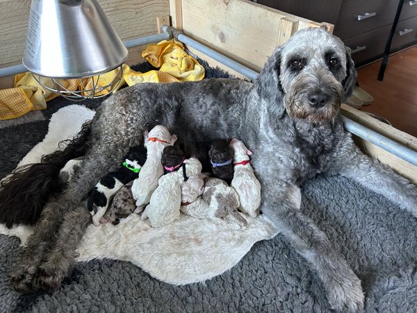 Een bevalling is iedere keer weer spannend en anders. Onder toeziend oog bevallen onze mama's in de voor hen vertrouwde, stressvrije en veilige omgeving. Een intensief moment waar wij als fokkers iedere keer weer erg van genieten. Bijna als 'trotse ouders' brengen en houden wij de nieuwe baasjes van alle ontwikkelingen op de hoogte. De eerste weken van de pups draaien voornamelijk om rust en groei, bezoek is dan nog niet gewenst.